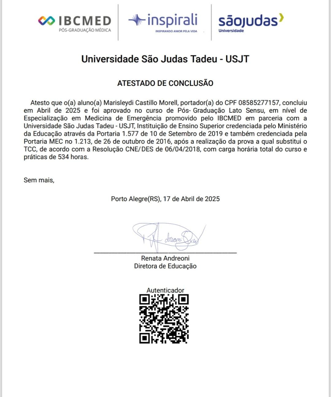 Minha formação foi construída com dedicação e amor pela medicina. Tenho diploma revalidado pela Universidade Federal de Santa Catarina e pós-graduação em medicina do trabalho, perícias médicas, emergência, diabetes e obesidade, além de medicina de família e comunidade. Busco sempre me atualizar para oferecer um atendimento seguro e de qualidade.